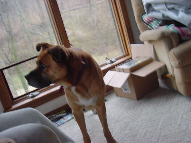 Tyson is a dog I fostered from January to April. To make a long story short, Tyson has been through abandonment, changed outside for long periods of time and moving with his owner from house to house. They have had a string of really bad luck in the past couple of years. Tyson is a boxer mix. His picture is below. Tyson's owner was hit by a SUV on 12/31/03. Tyson's owner is a friend of my husband and I. I felt the only thing we could do for him was to care for Tyson and work on his aggression issues. We made progress in this area. Aggression is a VERY TOUGH ISSUE. Tyson was given to me by his wife and I paid for his vet expenses because his shots were not updated, he needed to have a heartworm test and neutering.